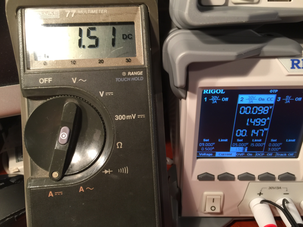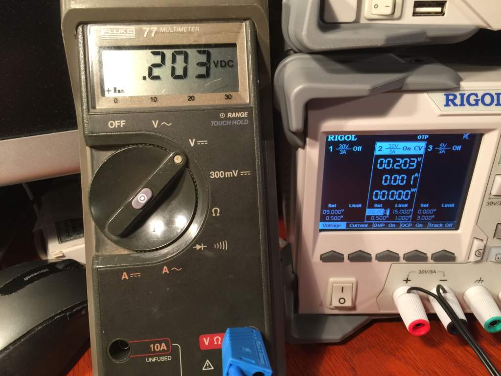 Recently, I got myself a Rigol DP832 bench power supply, which has a stated accuracy around 0.1% on all parameters, so I thought it would be interesting to see how much the Fluke differs; i.e. how much it has drifted over the last 35 years. I think the pictures speak for themselves, showing the volt, millivolt, amps, and milliamps ranges. Identical values, with a difference only in the least significant digit. I.e., rounding errors. Wow.
