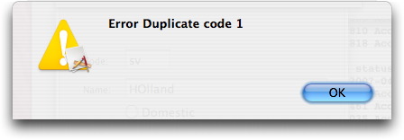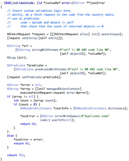 There’s also the nifty “self != %@” construct in the predicate. The token “self” will be replaced by the objects identity in the database. If the object is new and not yet in the database, there won’t be an identity, but that’s ok. No other record with the same code should be found if the current record is entirely new, so that’s fine.