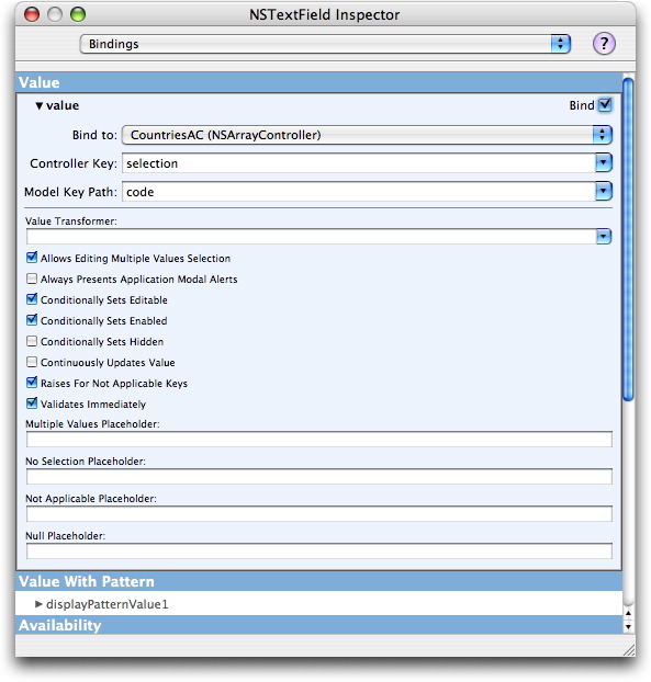 Normally, the validation code only gets called when you save to disk, and that’s far too late. To make it fire right after you have edited the field on screen, there’s a little checkbox you need to set in Interface Builder. Open the “country.nib”, open the “DetailsView”, that is the pane that will become the drawer. Select the “Code” field, open the inspector if it isn’t already open (cmd-shift-I). Select “Bindings” in the top combobox, and then expand the “Value” row. What you’ll see is this: