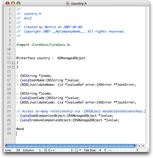 As you can see, the “country” object is derived from NSManagedObject and the accessors and validators are declared. We need to include code in one of these methods, namely “validateCode”, and we’ll do that in the country.m file, of course.