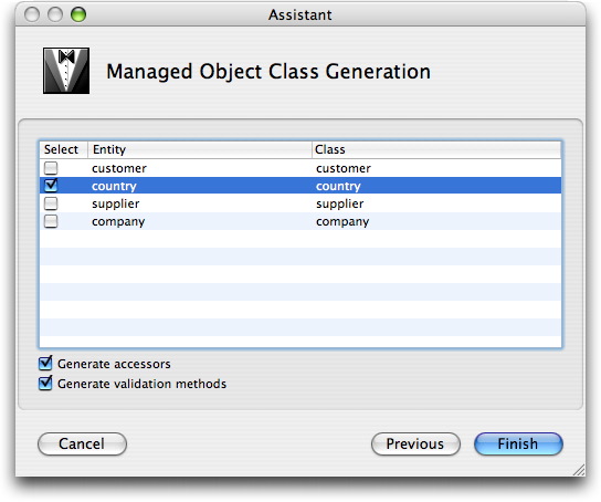 What this screen does is that it subclasses NSManagedObject for the entities that you choose. You can choose to include methods for the accessors, the validation methods, or both. In my experience, the validation methods don’t get written at all if you don’t choose “Generate Accessors” as well. Probably a bug. Anyway, do what I did in the screenshot, then click “Finish”.