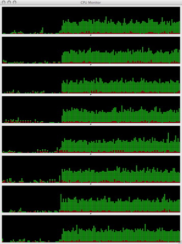 For the last half hour I’ve been watching grass grow, or rather the Mac OSX Stuffit Expander unpack excercise files from Lynda.com. These excercise files are for Final Cut Express HD and consists of 12 sitx files, each around 240 Mb. …ah, it just finished. Looking at how the CPUs are loaded during the execution of the Expander, it’s no mystery why it’s so slow: