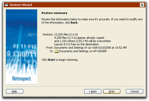 Time to do the restore from Retrospect. I’m running Retrospect for Windows, since it has more features than Retrospect for the Mac. Only one feature is missing in the Windows version and that is backing up to FTP, but I can live without it. The Retrospect I’m using came with the Netgear ReadyNAS NV+ I bought. I then bought a 5-pack of client licenses extra, so I can backup 10 clients with it. The ReadyNAS has 4 drives, each 500 Gb in an XRaid configuration (similar to RAID 5 but expandable on the fly), giving me around 1.5 Tb of backup space.
