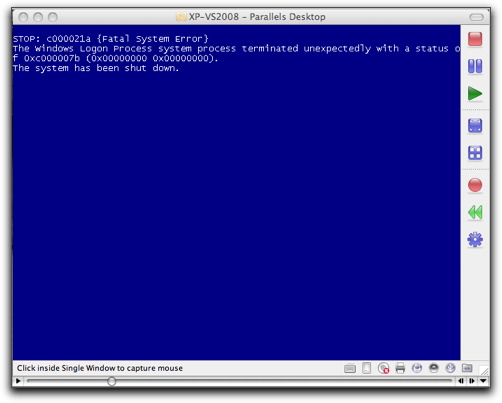 The worst just happened. The Windows XP instance I use for development, the one with VS 2008 on it, just bluescreened, then did disk repair, then went into a bluescreen cycle. Can’t break out of it even with safe boot. This is the one instance I have my development source in, and the one instance I updated to SP3. I can hear you snicker already. I’ll try to shoot a movie of the rebooting so you can enjoy it fully. Plus it may give me a chance to see what the error code actually is. Click the image for the movie.
