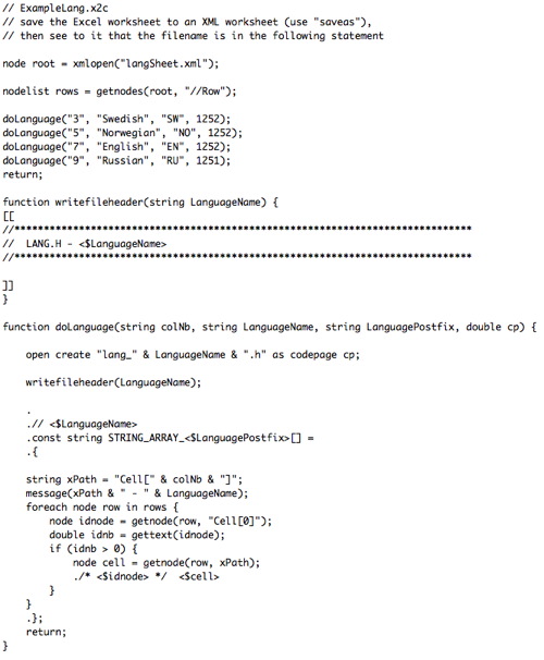 Especially for this last use, I recently adapted the text output file command in x2c to allow output to ASCII, unicode (default), or any codepage you have installed on the Windows system you’re running this thing on. In the above script example, you see codepage 1251 used for Russian. In this case this was necessary since the C++ compiler used (Borland) couldn’t use unicode header files. This script runs under US or Swedish XP and Vista, as long as codepage 1251 is also installed on the system, and then produces the right MBCS file for Borland C++, resulting in binaries that will look real to russians running russian versions of Windows. Note that above is the complete script that is needed to convert the excel spreadsheet to four different C++ header files and it can easily be run from a build script.