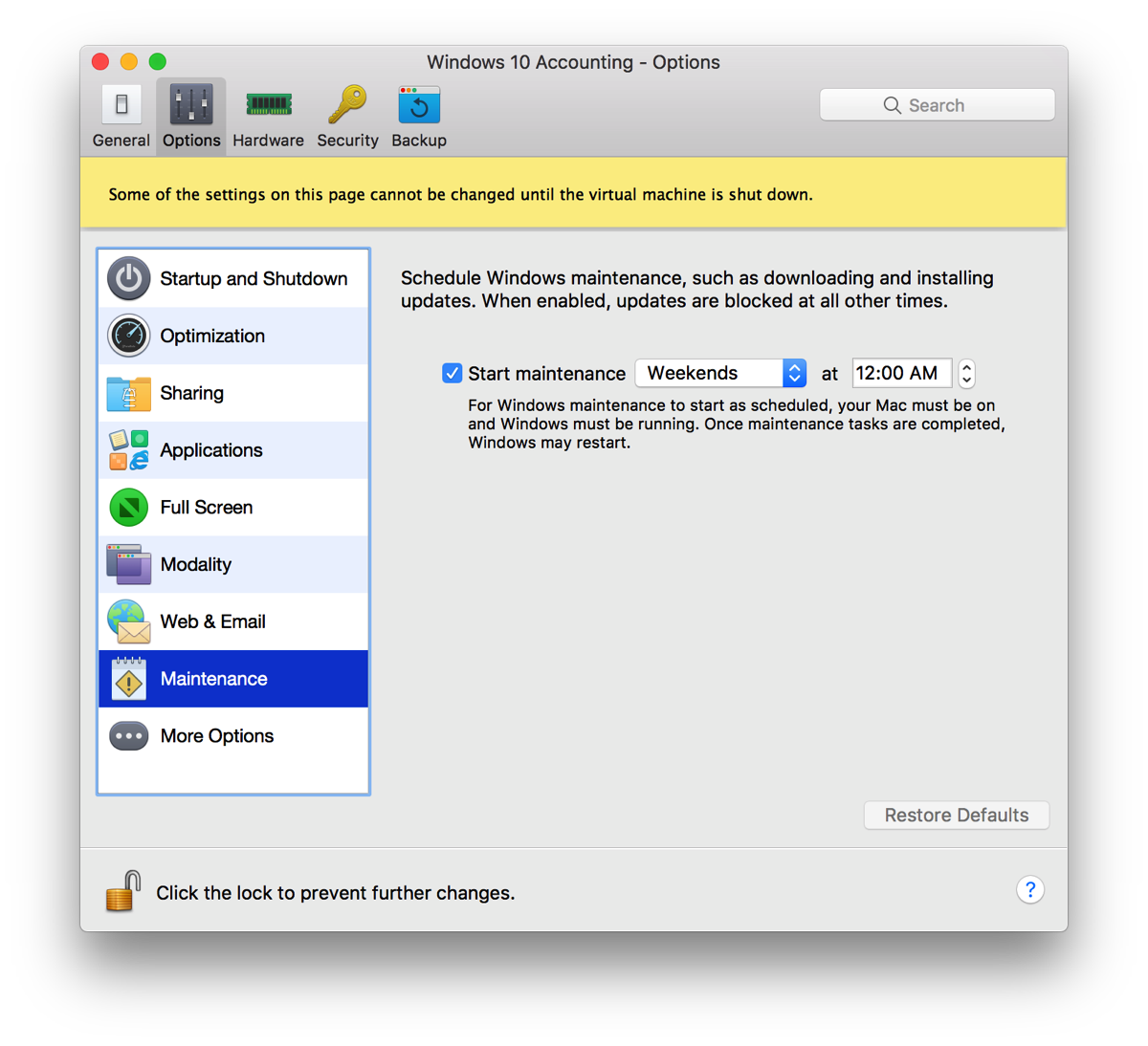 I just discovered that Parallels v12 has a really nice feature, namely to stop Windows from doing updates except for a predetermined period. Brilliant! It’s also a sad testament to what Microsoft has done when it comes to respect for the user’s time and work.
