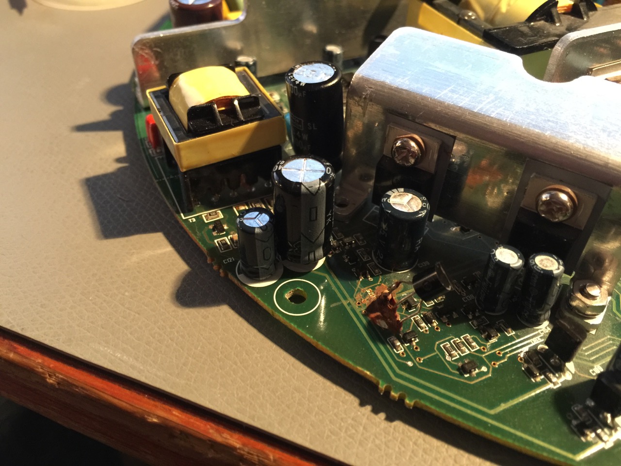 Back to capacitors, then. I could not see any bulging capacitors, but feeling around I found one that was so hot it almost burned my fingers. And that is really not normal. If this cap was shorting out3, it would explain everything, and sure enough, after replacing it, the system now works normally. The bad capacitor was labeled C122 on the board, a 330 µF/25V, which I replaced with a 470 µF/35V, simply because I had no 330 µF at 25V or more. Seems to do the trick, though.