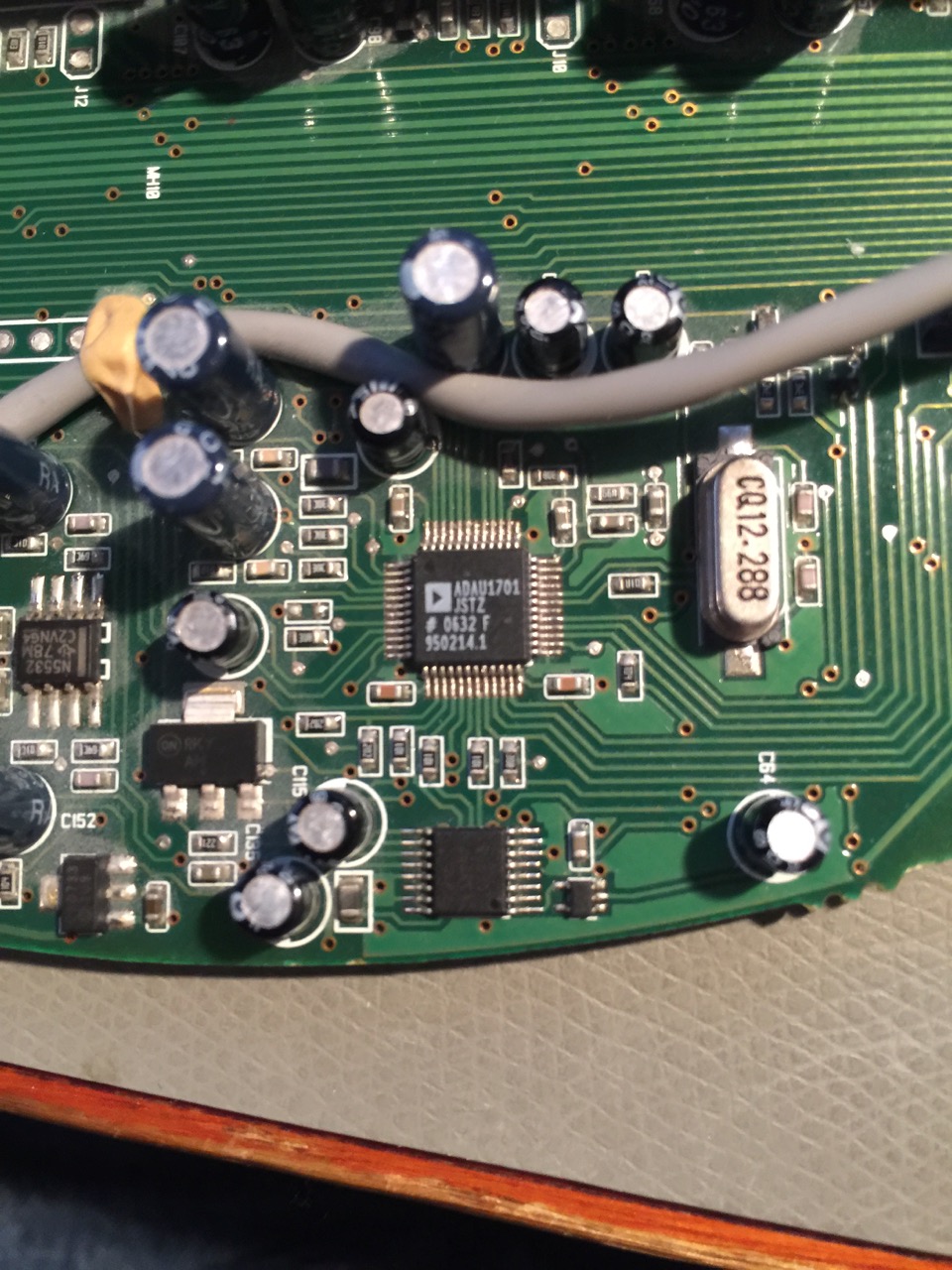 That, to me, meant that a large smoothing capacitor must have failed. The huge ripple on the power line must have severely screwed up the workings of the ADAU1701, which is a ADC/DAC signal processor and which does practically everything that needs to be done to the audio before going to the power amplifier stage. No wonder I had no sound.