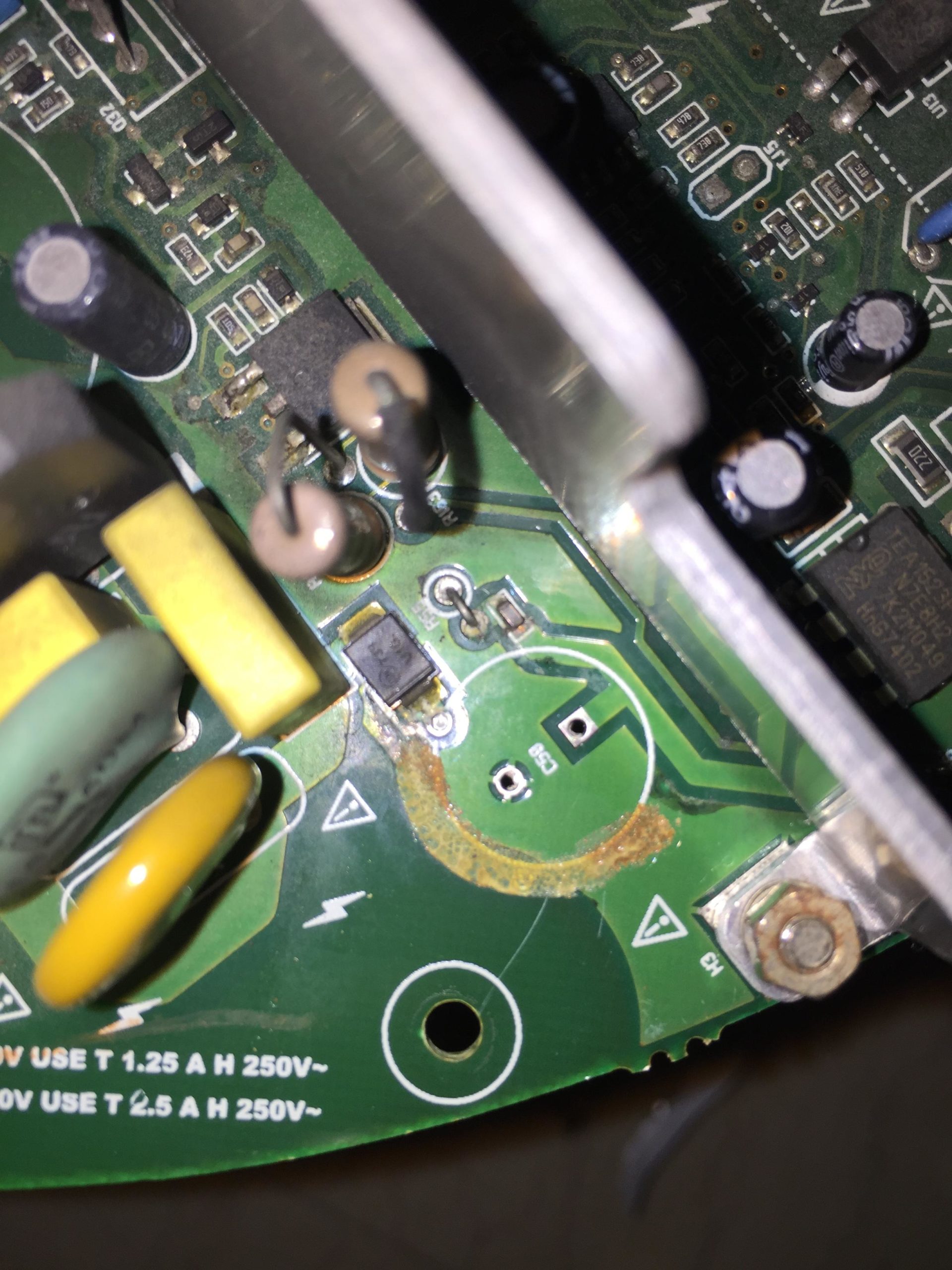 I replaced the fuse and capacitor. Did not work. Fused instantly blew again and the capacitor is shorted to ground. Used thermal gun and noticed 54 degrees celsius coming from the JNR15S050M Termistor…. its the green circle next to the 400v 22uf capacitor. Cant seem to find anywhere to buy this.