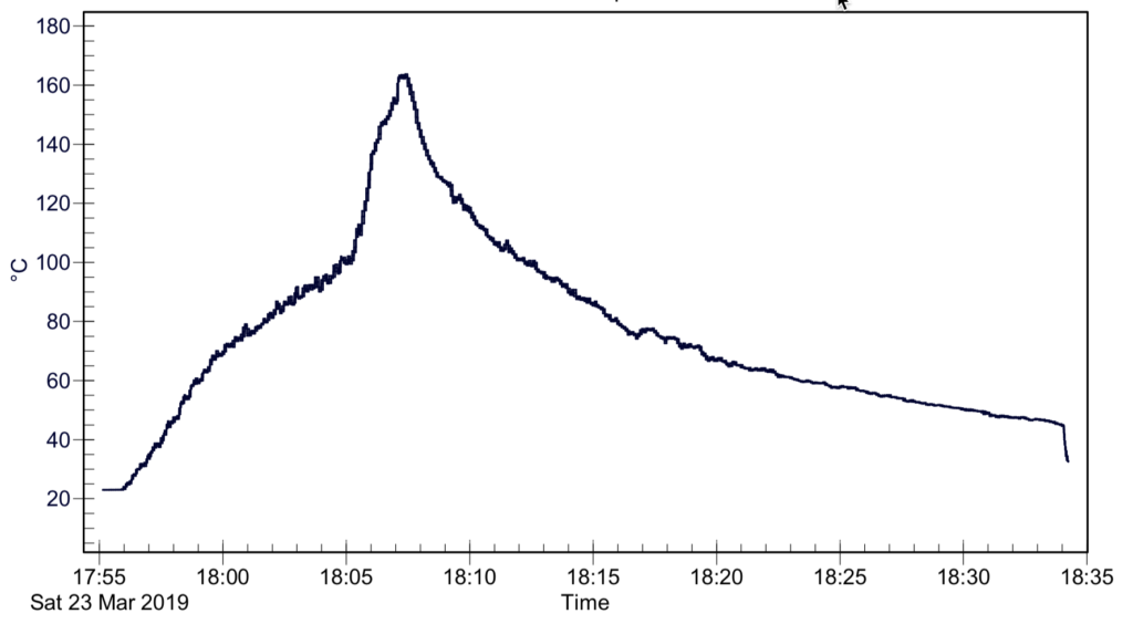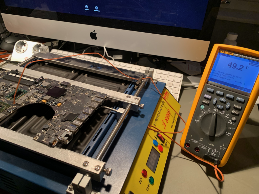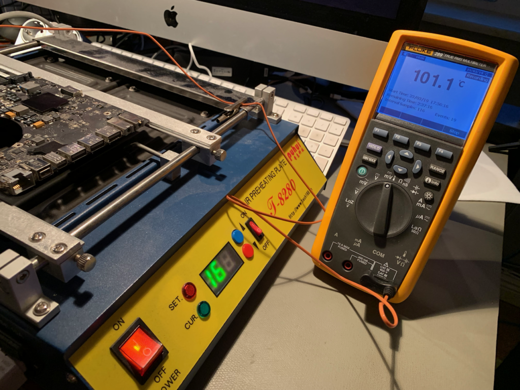 I first removed everything removable from the main board and set it up in a preheater. I stuck the Fluke thermocouple into a mounting hole close to the GPU so I could monitor the temperature of the board.This is the GPU the guy in the UK put in a couple of years ago. The thermocouple is the orange lead top right.I set the hot air gun to 450 degrees Celcius and the air flow real low, so I wouldn’t blow away any components as the solder melted.Once the board temperature reached 100 degrees, I started heating the GPU with the air gun. It took about two minutes until the GPU made minor movements and then I kept heating for another 15 seconds or so. I then let the board slowly cool down until I got a reading under 50 degrees. Reassembled the computer and found it was still dead. Oh well, it was fun doing anyway.The temperature curve from the Fluke.